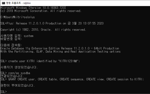 Sqlplus에서 sys계정으로 접속한다. 그 후 사용자 이름과 비밀번호로 계정을 만든 다음, 해당 계정에 권한을 부여한다. 정상적인 실행 화면은 다음과 같다.