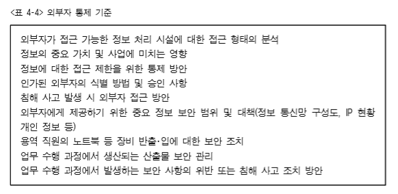 외부자가 접근하는 중요 정보(시스템 및 네트워크 구성도, 산출물 등)의 유출, 침해 사고를 예방하기 위하여 필요한 보안 요구 사항 항목을 정보 보호 정책서, 정보 보호 실행 계획, 정보 보호 지침 등을 분석하여 관리적 보안, 물리적 보안, 기술적 보안 측면에서 식별한다.