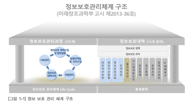 정보 보호 관리 체계는 관리 과정 5단계, 정보 보호 대책 13개 분야로 구성되어 있다.