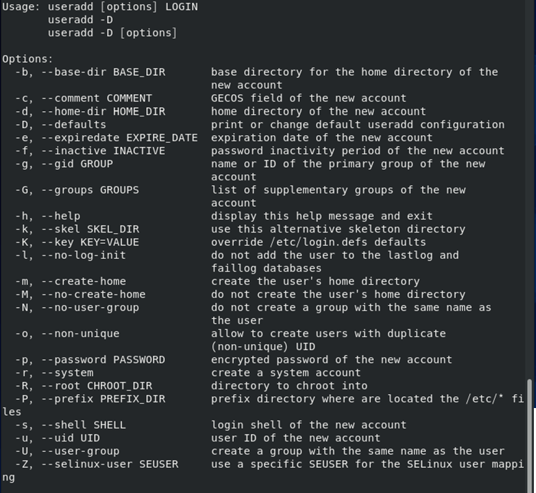 -D : /etc/default/useradd에 설정된 유저추가와 관련된 기본 사항들을 보여줌