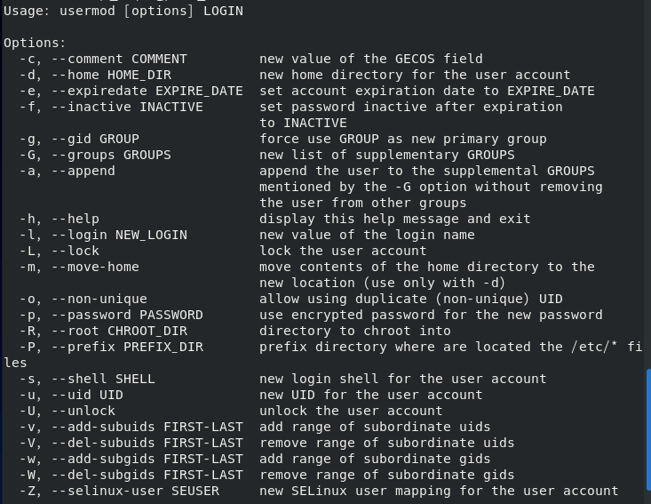 -m : 사용자의 홈 디렉터리 변경 시 기존에 사용하던 파일 및 디렉터리를 옮겨주는옵션으로 -d와 함께 쓰인다.