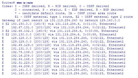 | I, R, O, C, S, E, B, I | ㅇ 목적지에 대한 정보를 얻었는지 표시 I - 목적지에 대한 정보를 IGRP 프로토콜에 의해 얻음 R - 목적지에 대한 정보를 RIP 프로토콜에 의해 얻음 O - 목적지에 대한 정보를 OSPF 프로토콜에 의해 얻음 C - 연결 S - 직접연결 E - 목적지에 대한 정보를 EGP 프로토콜에 의해 얻음 B - 목적지에 대한 정보를 BGP 프로토콜에 의해 얻음 I - 목적지에 대한 정보를 IS-IS 프로토콜에 의해 얻음 |