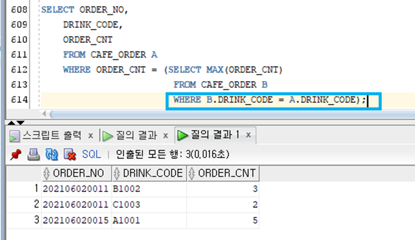 다음 쿼리는 음료별 가장 많은 주문 수량을 가진 주문번호를 조회한다.
