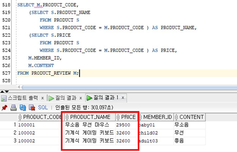 스칼라 서브쿼리를 이용하여 PRODUCT_REVIEW 테이블에 존재하지 않는 PRODUCT_NAME, PRICE 데이터를 출력