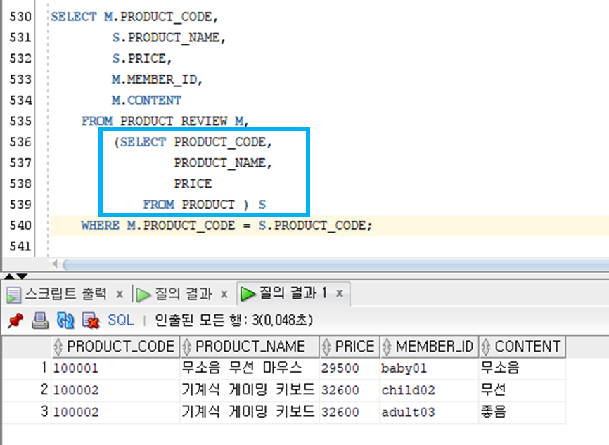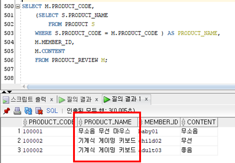 | 비연관 서브쿼리( Un-Correlated SubQuery ) | 메인 쿼리와 관계를 맺고 있지 않음 |