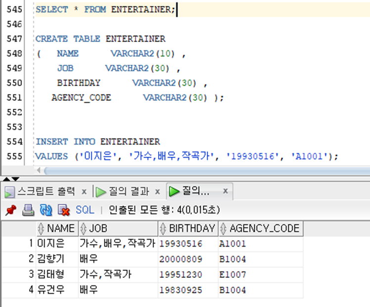 SELECT NAME, JOB, BIRTHDAY, AGENCY_CODE