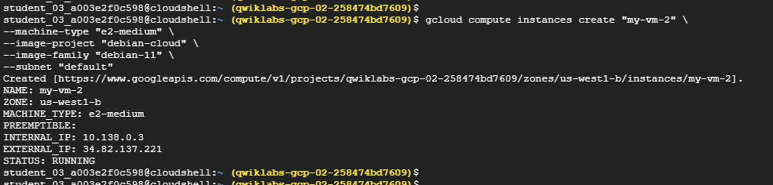 | gcloud compute instances create "my-vm-2" \ --machine-type "e2-medium" \ --image-project "debian-cloud" \ --image-family "debian-11" \ --subnet "default" |