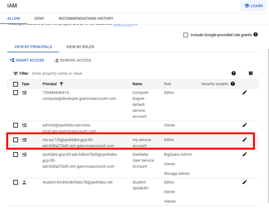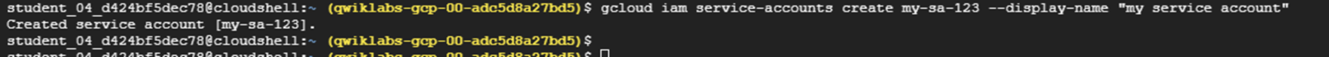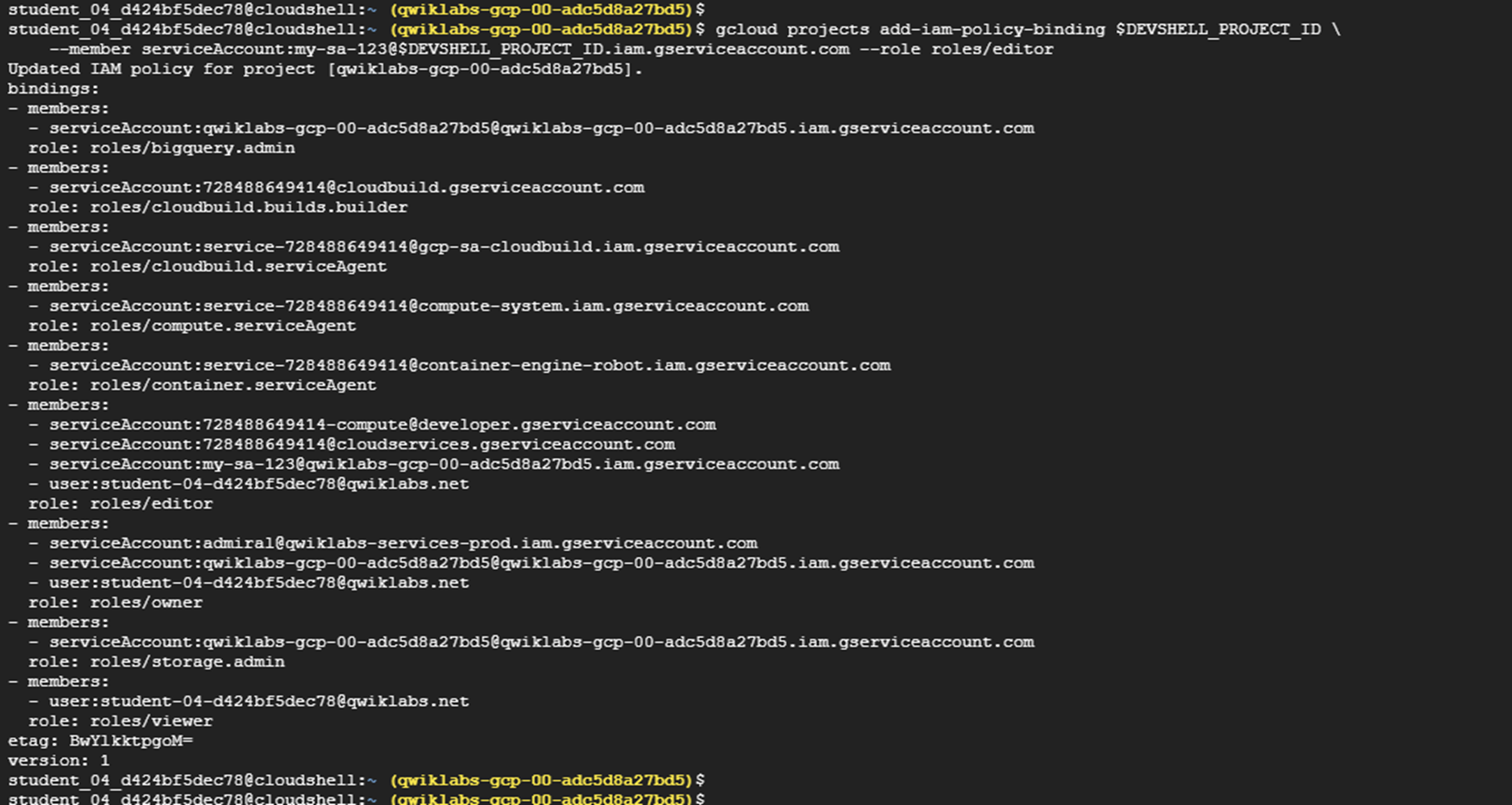 --member serviceAccount:my-sa-123@$DEVSHELL_PROJECT_ID.iam.gserviceaccount.com --role roles/editor
