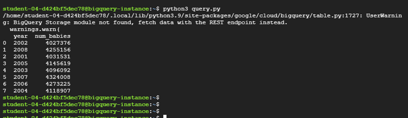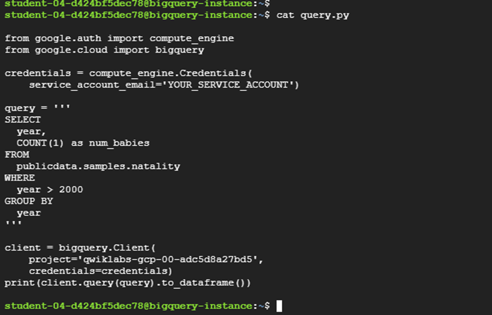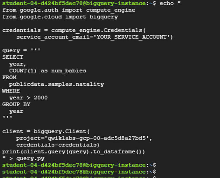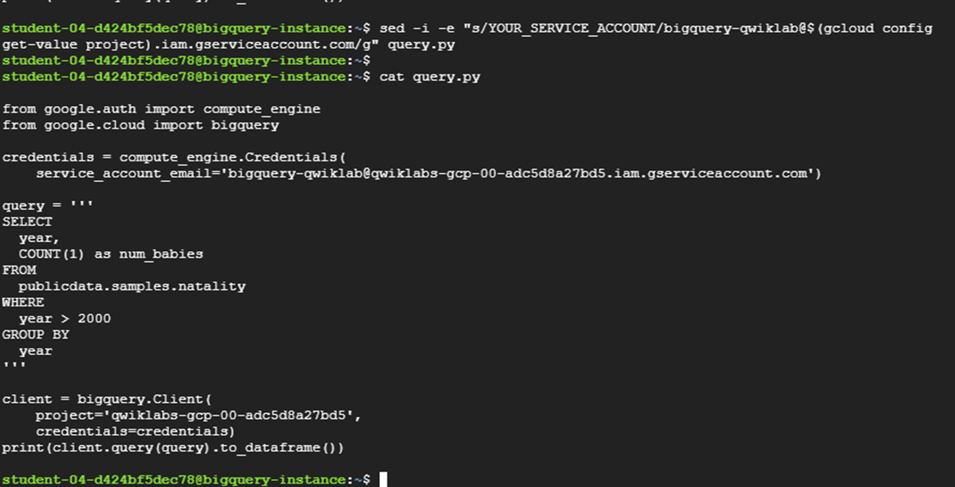 sed -i -e "s/YOUR_SERVICE_ACCOUNT/bigquery-qwiklab@$(gcloud config get-value project).iam.gserviceaccount.com/g" query.py