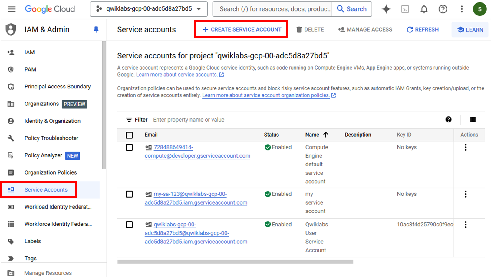 gcloud iam service-accounts create my-sa-123 --display-name "my service account"