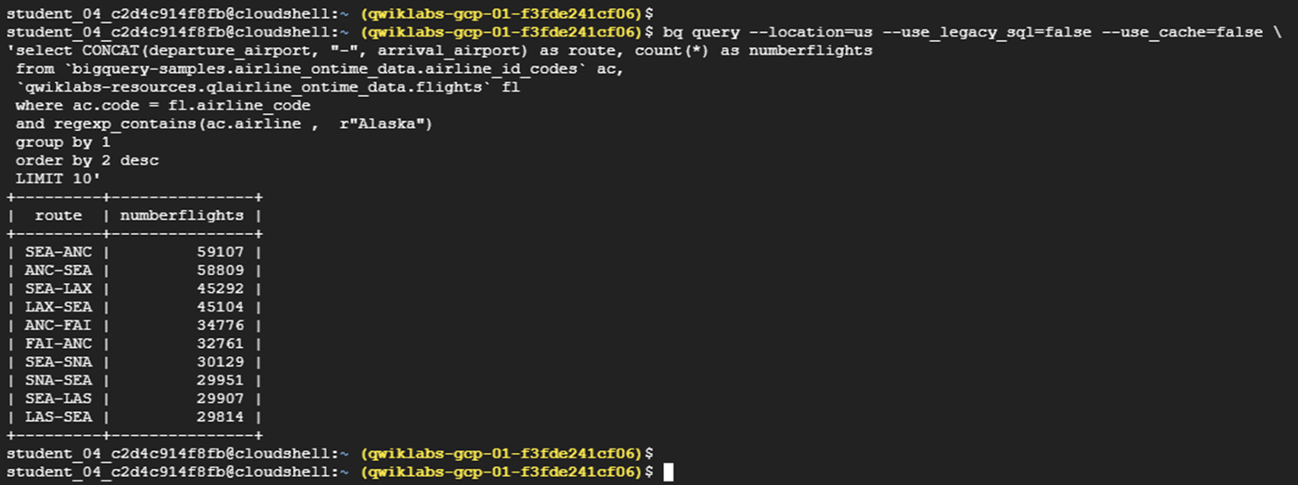 | bq query --location=us --use_legacy_sql=false --use_cache=false \ 'select CONCAT(departure_airport, "-", arrival_airport) as route, count(*) as numberflights from `bigquery-samples.airline_ontime_data.airline_id_codes` ac, `qwiklabs-resources.qlairline_ontime_data.flights` fl where ac.code = fl.airline_code and regexp_contains(ac.airline , r"Alaska") group by 1 order by 2 desc LIMIT 10' |