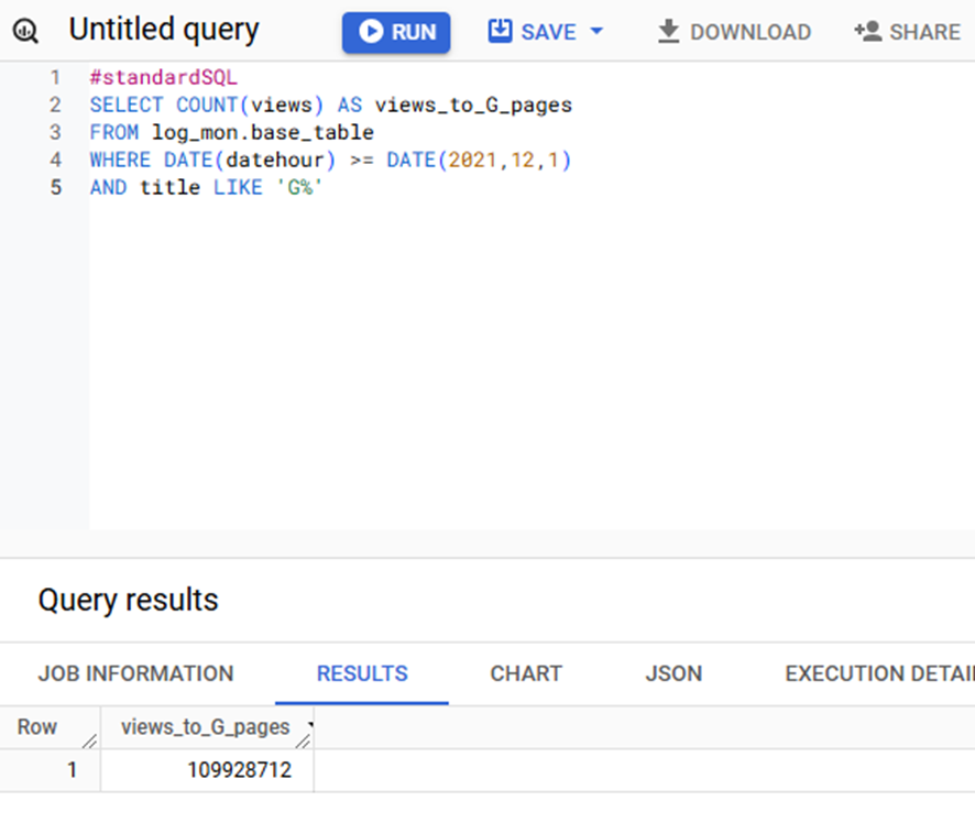 | #standardSQL SELECT COUNT(views) AS views_to_G_pages FROM log_mon.base_table WHERE DATE(datehour) >= DATE(2021,12,1) AND title LIKE 'G%' |