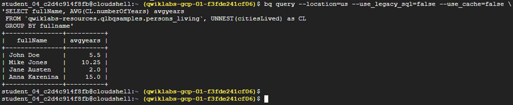 | bq query --location=us --use_legacy_sql=false --use_cache=false \ 'SELECT fullName, AVG(CL.numberOfYears) avgyears FROM `qwiklabs-resources.qlbqsamples.persons_living`, UNNEST(citiesLived) as CL GROUP BY fullname' |