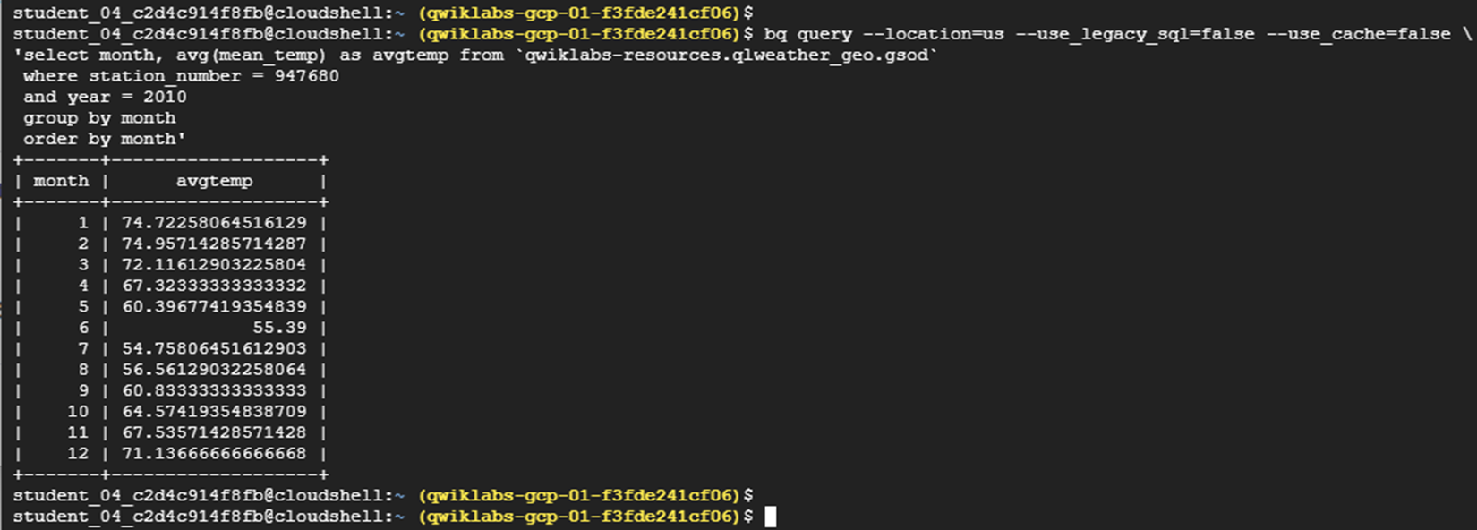 | bq query --location=us --use_legacy_sql=false --use_cache=false \ 'select month, avg(mean_temp) as avgtemp from `qwiklabs-resources.qlweather_geo.gsod` where station_number = 947680 and year = 2010 group by month order by month' |