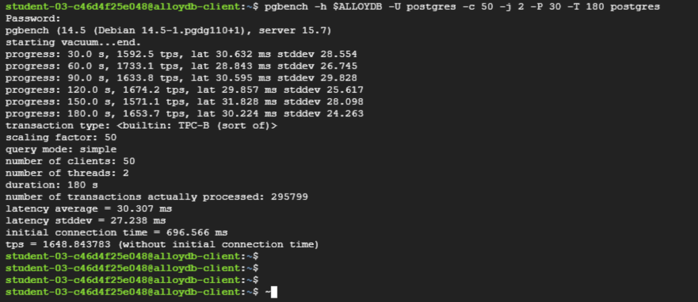 | pgbench -h $ALLOYDB -U postgres -c 50 -j 2 -P 30 -T 180 postgres |