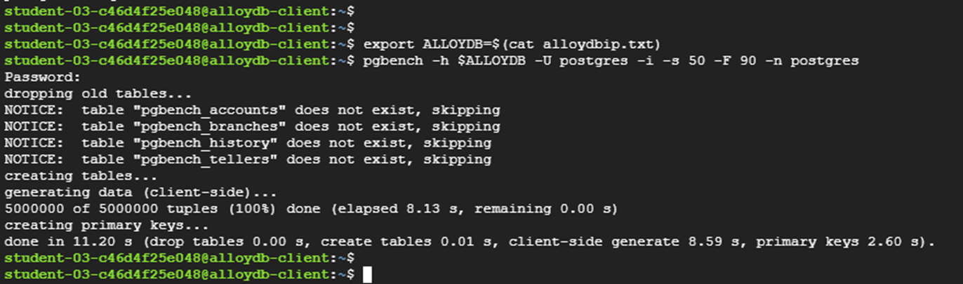 | pgbench -h $ALLOYDB -U postgres -i -s 50 -F 90 -n postgres |