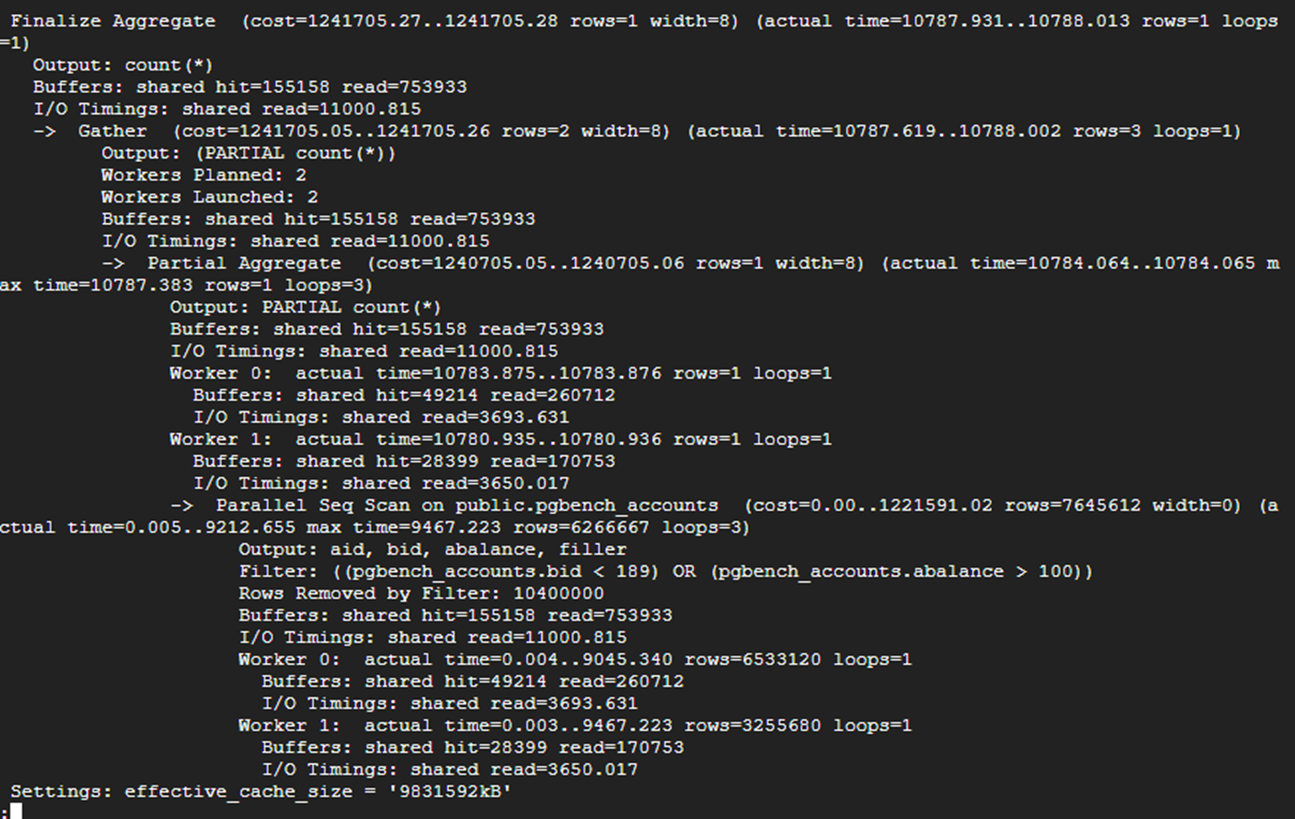 | EXPLAIN (ANALYZE,COSTS,SETTINGS,BUFFERS,TIMING,SUMMARY,WAL,VERBOSE) SELECT count(*) FROM pgbench_accounts WHERE bid < 189 OR abalance > 100; |