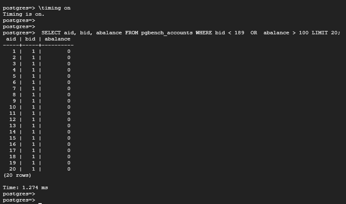 | SELECT aid, bid, abalance FROM pgbench_accounts WHERE bid < 189 OR abalance > 100 LIMIT 20; |