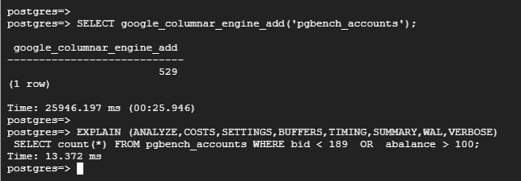 | SELECT google_columnar_engine_add('pgbench_accounts'); |