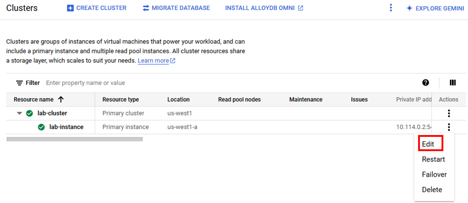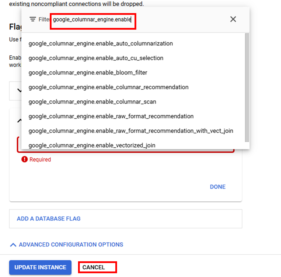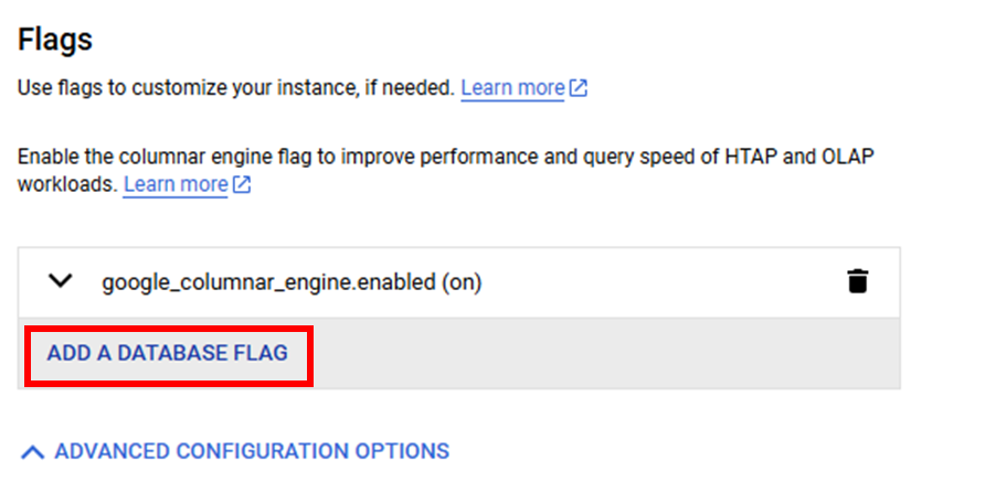 Notice that the flag named google_columnar_engine.enabled is already enabled (status of on). You will not add an additional flag as part of this lab.