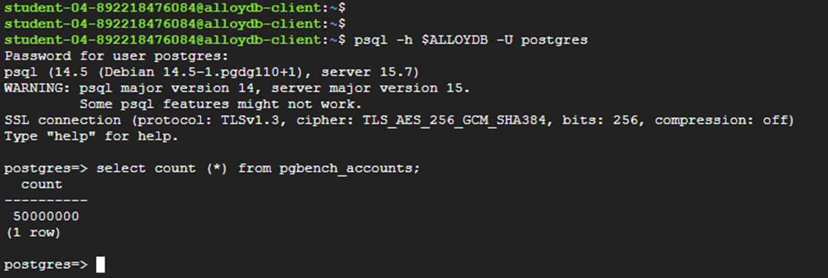 | psql -h $ALLOYDB -U postgres |