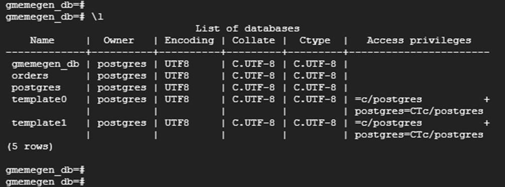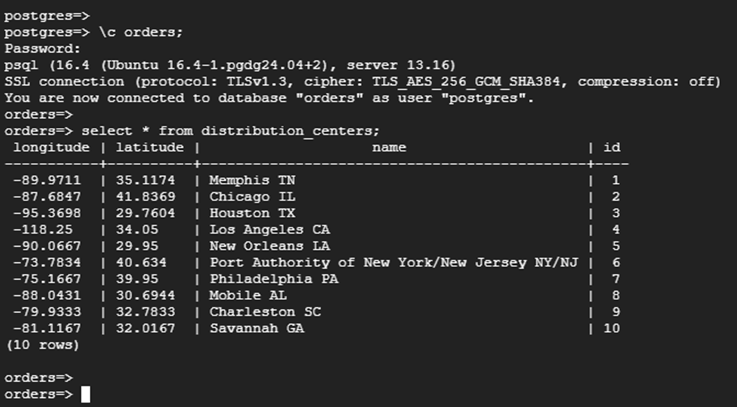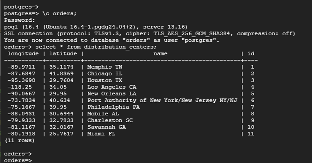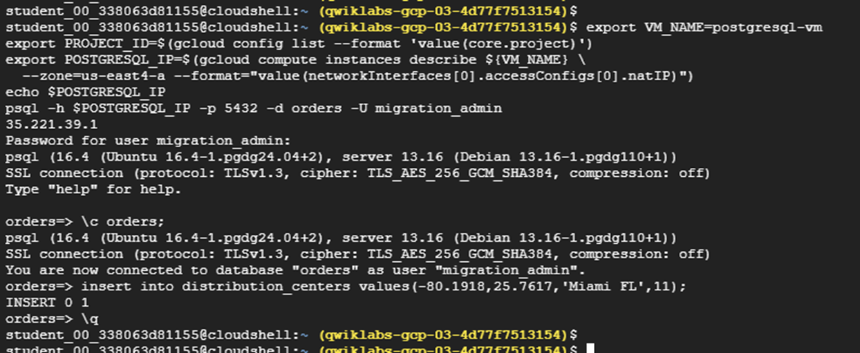 | export VM_NAME=postgresql-vm export PROJECT_ID=$(gcloud config list --format 'value(core.project)') export POSTGRESQL_IP=$(gcloud compute instances describe ${VM_NAME} \ --zone=us-east4-a --format="value(networkInterfaces[0].accessConfigs[0].natIP)") echo $POSTGRESQL_IP psql -h $POSTGRESQL_IP -p 5432 -d orders -U migration_admin |