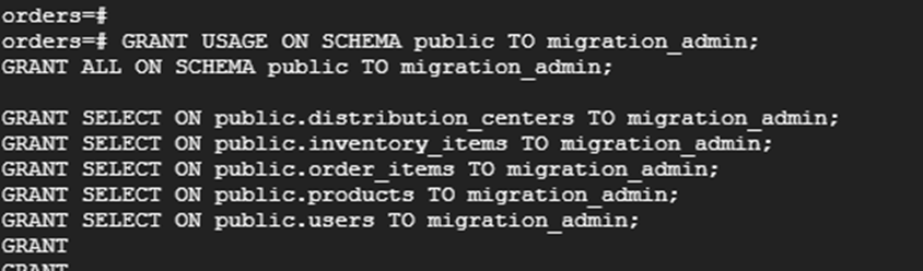 | GRANT USAGE ON SCHEMA public TO migration_admin; GRANT ALL ON SCHEMA public TO migration_admin; GRANT SELECT ON public.distribution_centers TO migration_admin; GRANT SELECT ON public.inventory_items TO migration_admin; GRANT SELECT ON public.order_items TO migration_admin; GRANT SELECT ON public.products TO migration_admin; GRANT SELECT ON public.users TO migration_admin; |