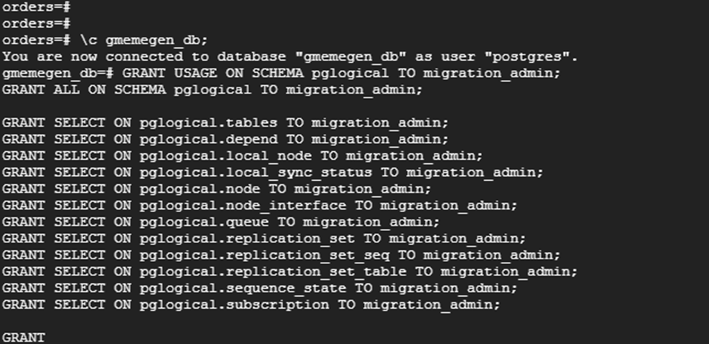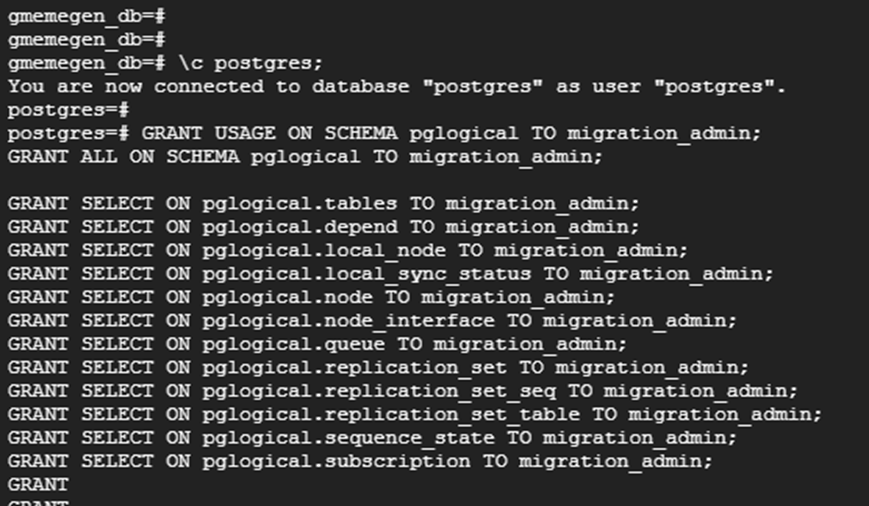 | GRANT USAGE ON SCHEMA pglogical TO migration_admin; GRANT ALL ON SCHEMA pglogical TO migration_admin; GRANT SELECT ON pglogical.tables TO migration_admin; GRANT SELECT ON pglogical.depend TO migration_admin; GRANT SELECT ON pglogical.local_node TO migration_admin; GRANT SELECT ON pglogical.local_sync_status TO migration_admin; GRANT SELECT ON pglogical.node TO migration_admin; GRANT SELECT ON pglogical.node_interface TO migration_admin; GRANT SELECT ON pglogical.queue TO migration_admin; GRANT SELECT ON pglogical.replication_set TO migration_admin; GRANT SELECT ON pglogical.replication_set_seq TO migration_admin; GRANT SELECT ON pglogical.replication_set_table TO migration_admin; GRANT SELECT ON pglogical.sequence_state TO migration_admin; GRANT SELECT ON pglogical.subscription TO migration_admin; |