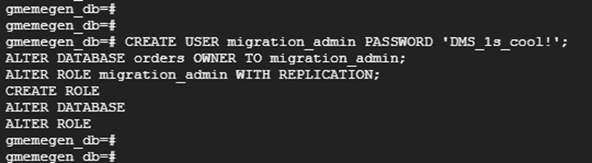 | CREATE USER migration_admin PASSWORD 'DMS_1s_cool!'; ALTER DATABASE orders OWNER TO migration_admin; ALTER ROLE migration_admin WITH REPLICATION; |