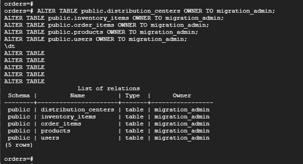 | ALTER TABLE public.distribution_centers OWNER TO migration_admin; ALTER TABLE public.inventory_items OWNER TO migration_admin; ALTER TABLE public.order_items OWNER TO migration_admin; ALTER TABLE public.products OWNER TO migration_admin; ALTER TABLE public.users OWNER TO migration_admin; \dt |