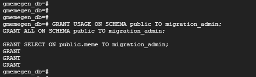 | GRANT USAGE ON SCHEMA public TO migration_admin; GRANT ALL ON SCHEMA public TO migration_admin; GRANT SELECT ON public.meme TO migration_admin; |