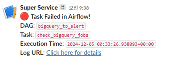 | from airflow import DAG import requests # Slack 알림에 사용 # Slack 알림 함수 def send_slack_alert(context, status): webhook_url = "https://hooks.slack.com/xxxx" task_instance = context.get('task_instance') dag_id = context.get('dag').dag_id task_id = context.get('task').task_id execution_date = context.get('execution_date') log_url = context.get('task_instance').log_url if status == "success": message = ( f":white_check_mark: *Task Succeeded in Airflow!*\n" f"*DAG*: `{dag_id}`\n" f"*Task*: `{task_id}`\n" f"*Execution Time*: `{execution_date}`" ) elif status == "failure": message = ( f":red_circle: *Task Failed in Airflow!*\n" f"*DAG*: `{dag_id}`\n" f"*Task*: `{task_id}`\n" f"*Execution Time*: `{execution_date}`\n" f"*Log URL*: <{log_url}|Click here for details>" ) response = requests.post( webhook_url, json={"text": message}, headers={"Content-Type": "application/json"} ) if response.status_code != 200: raise ValueError( f"Request to Slack returned an error {response.status_code}, response: {response.text}" ) # 성공 및 실패 시 Slack 알림을 보낼 콜백 함수 정의 def on_failure_callback(context): send_slack_alert(context, status="failure") def on_success_callback(context): send_slack_alert(context, status="success") # DAG 기본 설정 default_args = { "owner": "airflow", "depends_on_past": False, "email_on_failure": False, "email_on_retry": False, "retries": 1, "retry_delay": timedelta(minutes=5), "on_failure_callback": on_failure_callback, # 실패 시 알림 "on_success_callback": on_success_callback, # 성공 시 알림 } |