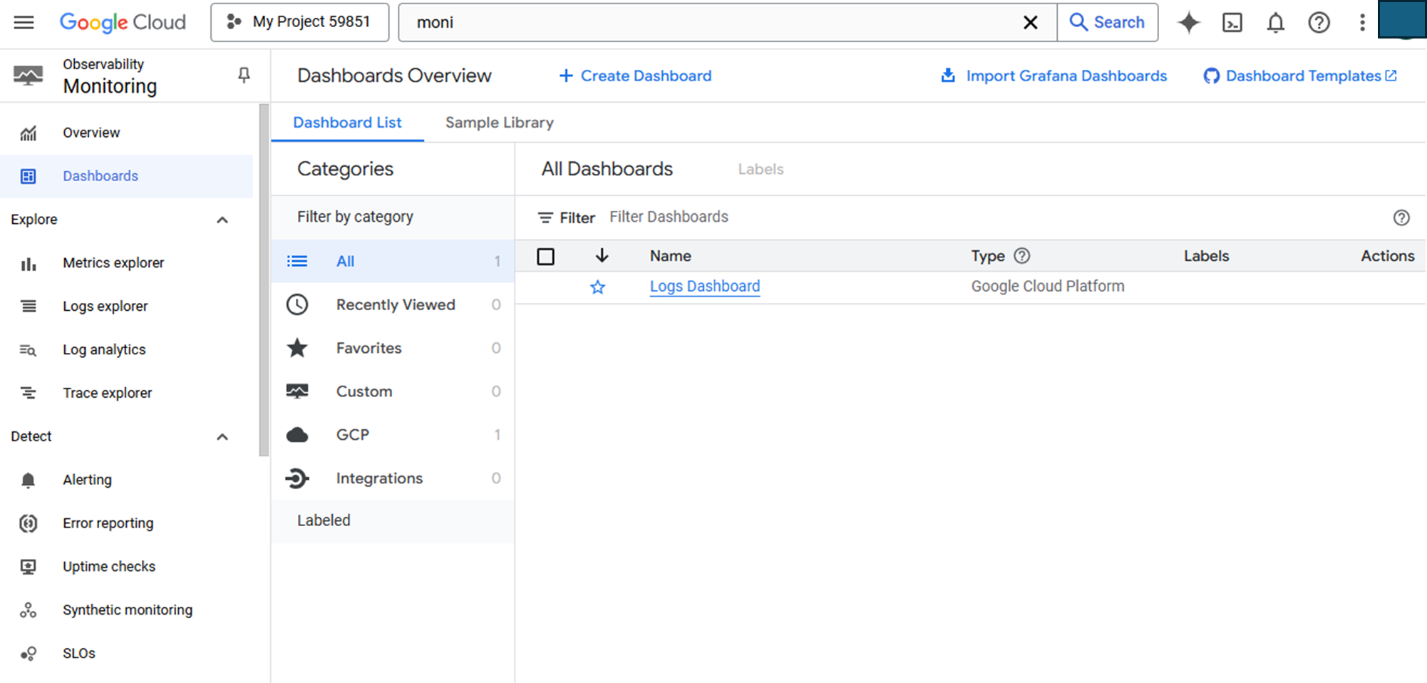 Monitoring Dashboard Configuration Editor 권한이 있기 때문에 create dashboard 버튼이 활성화 되어있다.