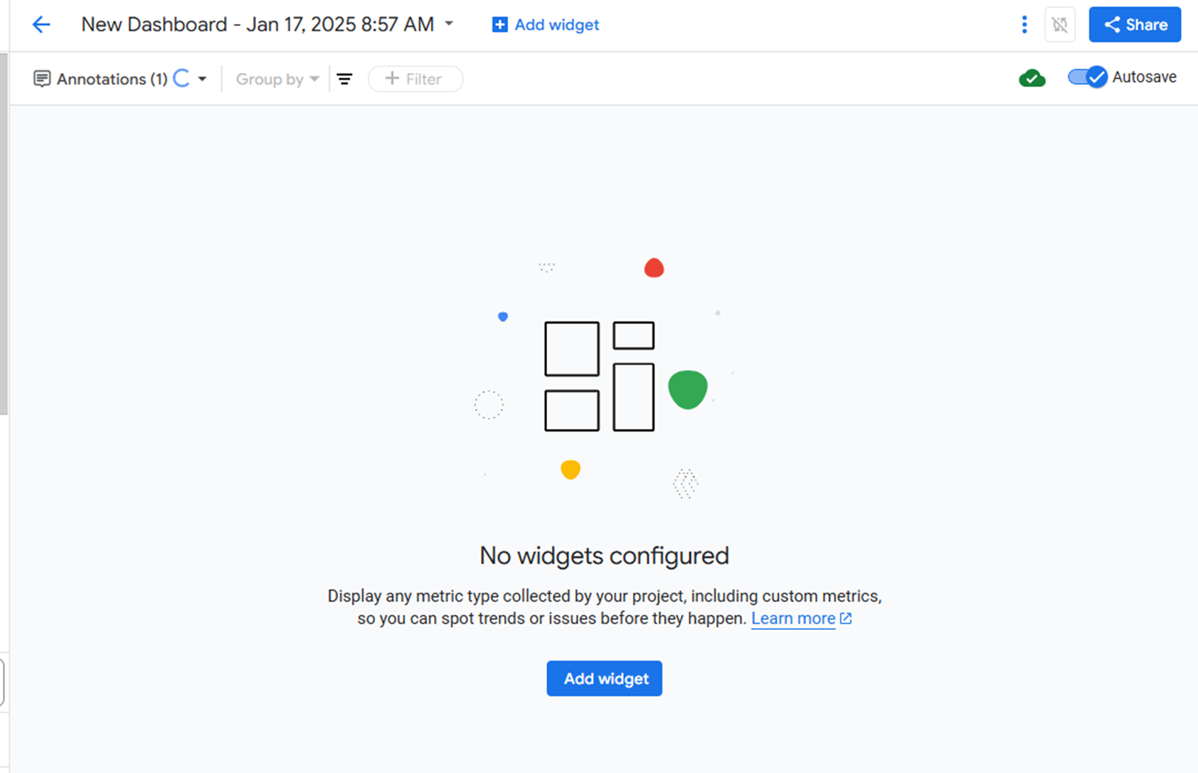 단순 Monitoring Dashboard Configuration Editor에서는 해당 역할이 없어 메트릭 데이터를 볼 수 없다.