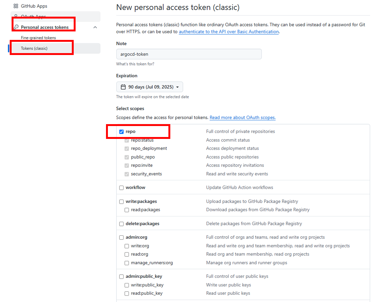 Argo CD에서 https://github.com/리포지토리 를 등록하려고 할 때 토큰 인증 방식으로 GitHub Private Repo에 접근하려면 이 토큰을 사용해야함