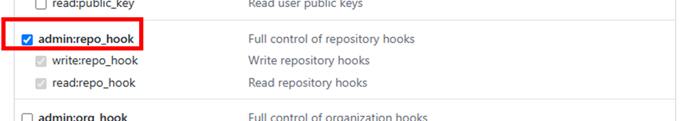 admin:repo_hook : GitHub 리포지토리에 Webhook을 생성·수정·삭제할 수 있는 관리자 권한을 의미