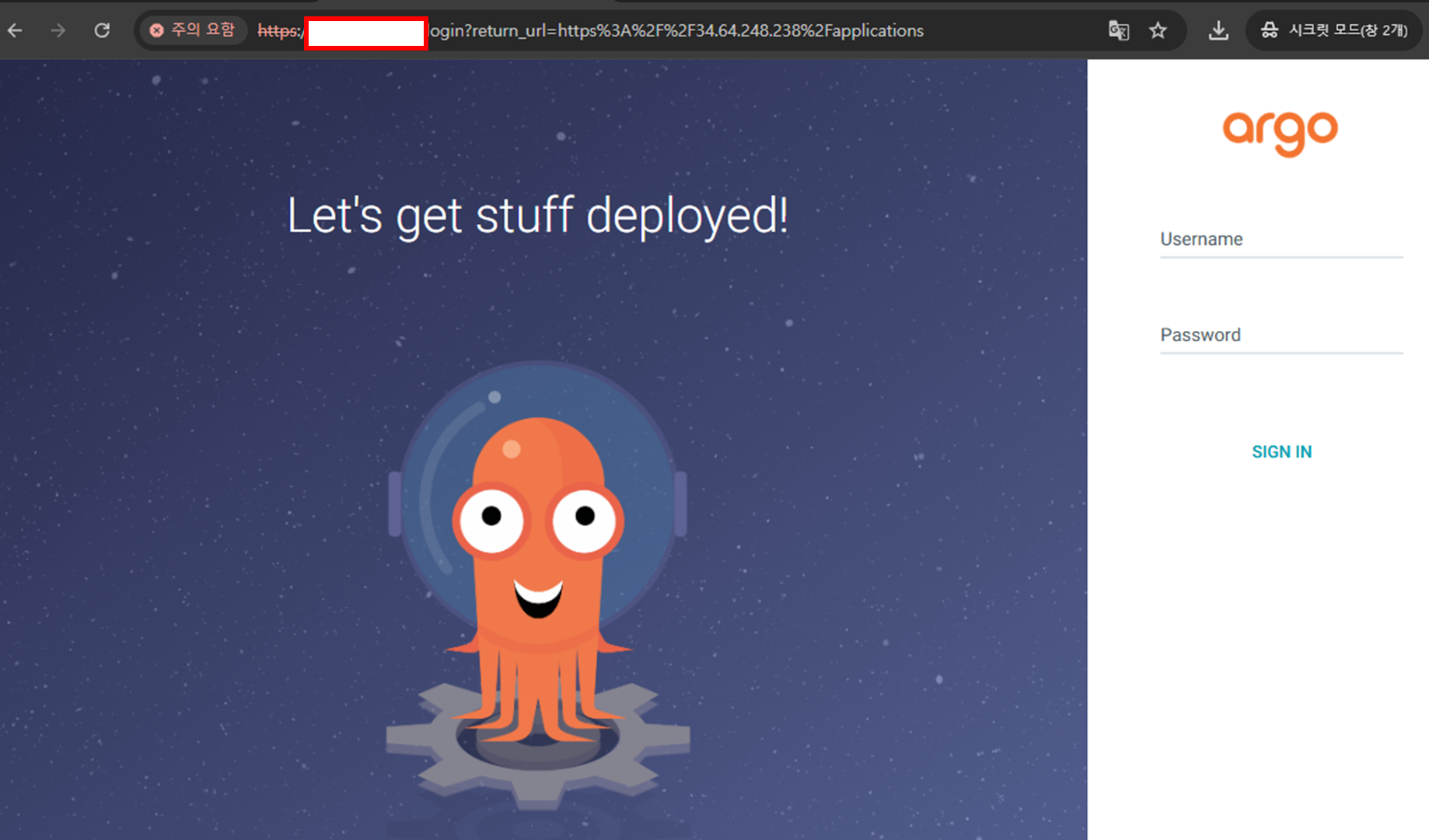 EXTERNAL-IP에 값이 뜨면, 그 IP를 브라우저 주소창에 입력하면 ArgoCD 접속 됨