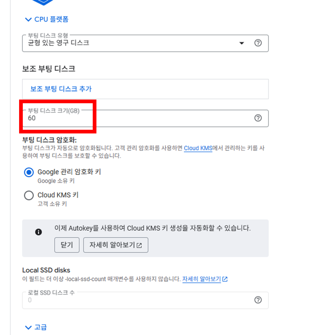 이건 상관없는건데, 무료크레딧을 받아 사용하다보니 할당량이 부족하여 디스크 크기 줄여 생성함