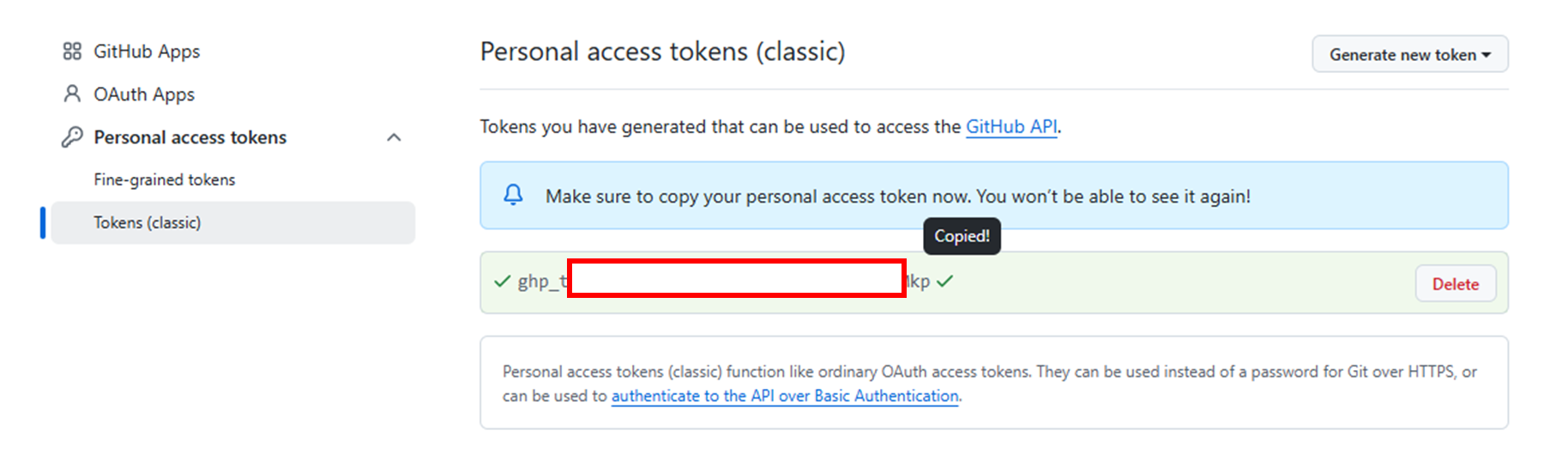 이 토큰은 다시는 확인할 수 없기 때문에, 반드시 복사해서 안전하게 저장하기!