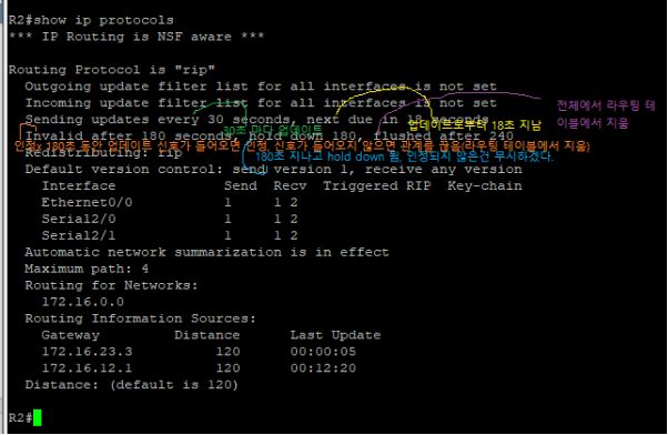 hold down- 또다른 180초(다른 네트워크가 목적지로 갈 수 있다고 해도 믿지 않음)를 유지시킴 hold down이 되기 전 flushed 240초 동안 업데이트가 이루어지지 않으면 라우팅 테이블에서 빠지게 됨 hold down 끝나기 전 flushed가 먼저 끝남