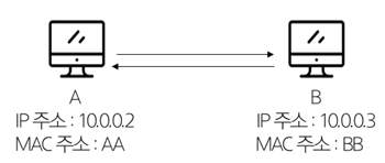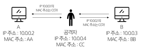 - 2. 공격자가 B에게 자신의 MAC 주소를 A의 MAC 주소인것처럼 속인다.
