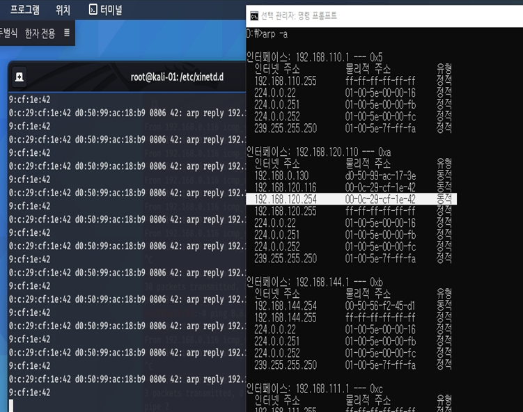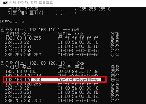 •cmd에서 arp -a 명령어를 통하여 IP 주소와 MAC 주소를 확인할 수 있다. (리눅스의 경우 arp)
